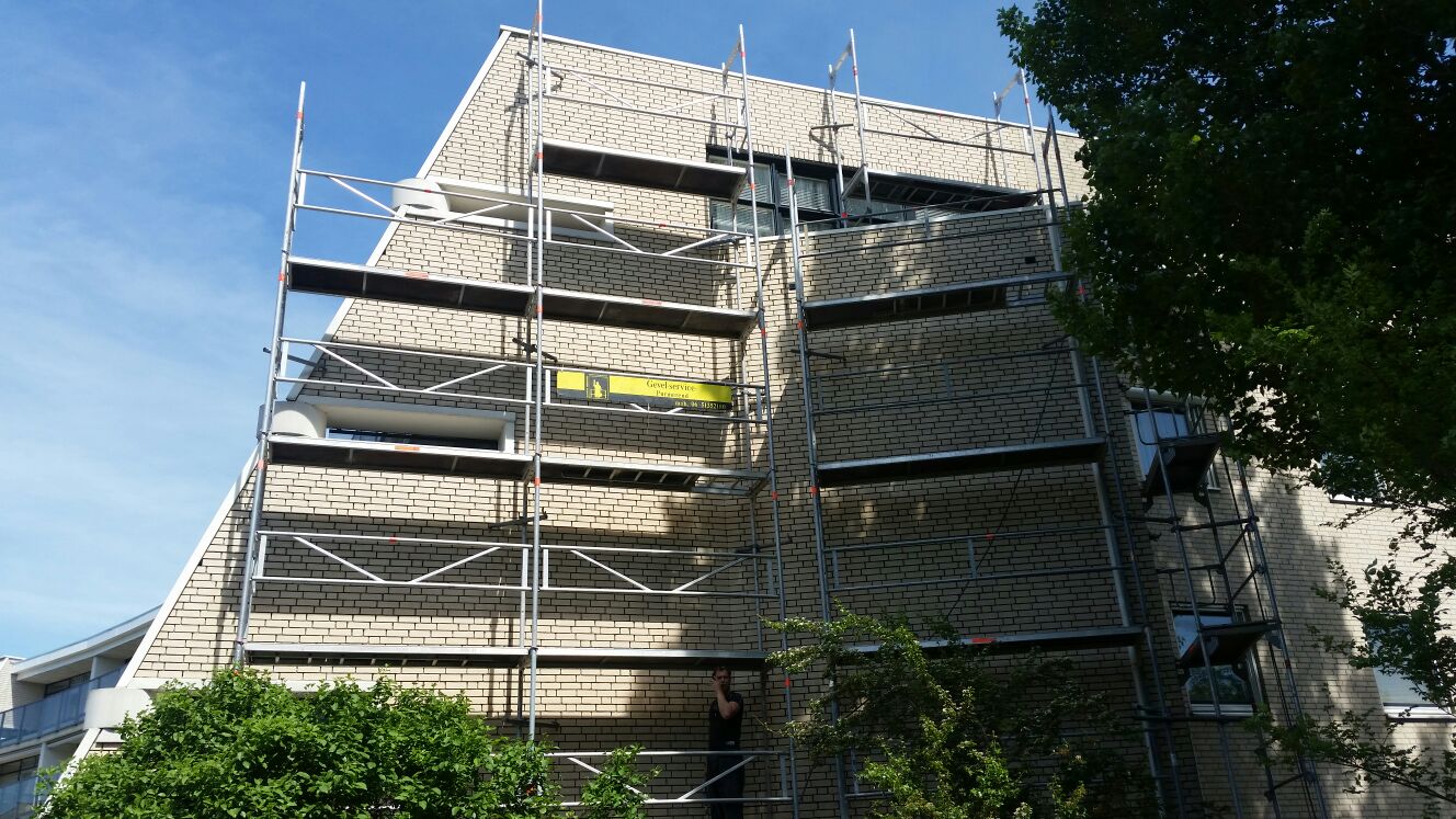 Het uithakken van de voegen, Aanbrengen van een mos en alg dodend middel,Reinigen van de gevel d.m.v. hoge druk warm water, voegen, het vervangen van de oude dilatatievoegen , en opnieuw het aanbrengen van nieuwe dilatatie kit, Het aanbrengen van een flexibele voeg tussen de latei en het metselwerk, Als laatste het impregneren van het geel.